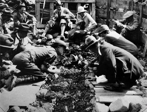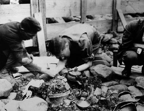 유물을 발굴 중인 구스타프 황태자(가운데). 왼쪽은 발굴책임자인 고이즈미 아키오이다.