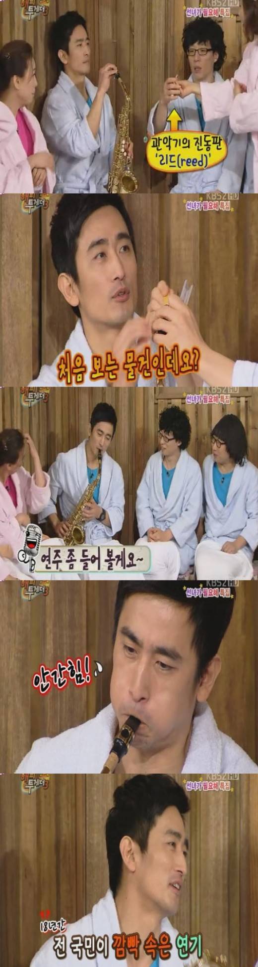 이에 군악대 출신으로 색소폰을 불 줄 안다는 G4 정범균은 "그렇게 불면 소리가 안 난다"라고 자세를 지적하면서도 역시나 숨소리와 '뿌' 어색한 소리를 내 출연자들의 배꼽을 잡게 했다.