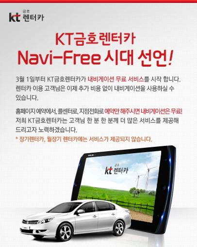 KT금호렌터카는 오는 3월1일부터 모든 차량 렌트 고객 대상으로 내비게이션을 무료 대여 서비스를 실시한다고 28일 밝혔다.