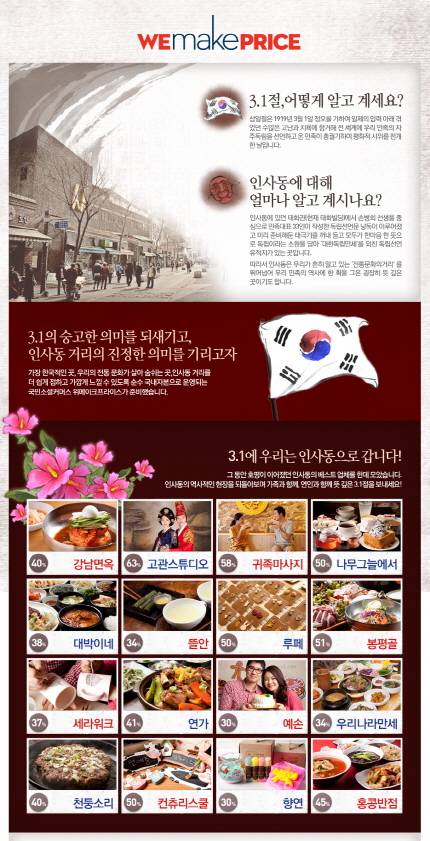 위메프는 순수 국내 자본으로 운영되는 토종 소셜커머스라는 점이 3.1절의 의미와 맞아떨어지고, 당시 독립운동가 33인이 모였던 태화관이 위치했던 곳이 인사동이라는 점을 기념해 이벤트를 마련했다고 설명했다.