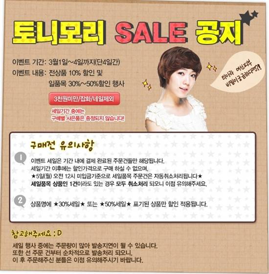 토니모리는 2006년 설립돼 최근 2년간 고속성장하고 있는 화장품 업체다. 걸그룹 티아라를 광고모델로 내세우며 젊은 세대에 어필했다. (사진=토니모리 반값세일 공지)