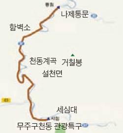 덕유산국립공원 북쪽에 만들어진 이 길을 따라가면 무주구천동 33경의 제1경인 나제통문에서부터 와룡담·학소대·세심대를 거쳐 제14경 수경대까지 골고루 감상할 수 있다. 물소리와 바람결이 이끄는 대로 가다가 길옆에 멈추면 그곳에 절경이 있다. 무주구천동은 첩첩산중 깊은 골짜기의 대명사다. 9000굽이 계곡에 1000가지 넘는 풀과 나무가 있다 해서 구천동이라 불린다.