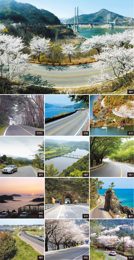 겨울잠 자던 개구리가 깨어나 꿈틀거리기 시작한다는 경칩(驚蟄·5일)이 지났습니다. 아직 바람엔 찬 기운이 남아 있지만 이제 곧 봄꽃들이 전국 곳곳에서 얼굴을 내밀 겁니다. 올해도 많은 사람이 주말이면 산과 들로 봄나들이를 갈 텐데요. 국토해양부는 얼마 전 드라이브 즐기기에 좋은 우리나라의 경관도로(Scenic Road) 52곳을 선정했습니다. 이 가운데 13곳을 꼽아 소개합니다.