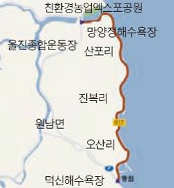 해벽(海壁·해안에 인공으로 쌓은 벽)과 파도가 만나는 곳에 길이 있다. 울진 명물인 해안 드라이브 길은 망양정 아래서 시작한다. 탁 트인 동해를 내내 보며 달리는 길이다. 창을 열면 시원한 바닷바람에 섞인 짠 내가 밀려든다. 우뚝 솟은 촛대바위 앞에선 차를 세우고 기념사진을 찍는 연인도 심심찮게 볼 수 있다. 통행량이 많지 않아 자전거를 타거나 거리낌없이 길을 건너는 마을 사람들이 있으니 조심 운전해야 한다.