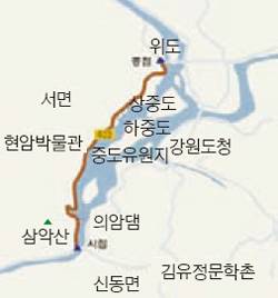 서면지구대 앞에서 'U' 자 모양 급커브를 지나면 거의 직선으로 북쪽을 향해 달릴 수 있다. 의암호에 바짝 붙어 달리기 때문에 경치 감상하기에 좋다. 호수에 떠 있는 섬들의 이름은 남쪽에서부터 붕어섬·하중도·상중도 등이다. 경관이 아름다워 마라톤 대회도 자주 열린다. 길가에서 마음에 드는 카페를 골라 호수와 춘천 시내를 바라보며 즐기는 차 한 잔의 여유가 나들이의 즐거움을 살려준다.