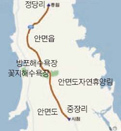 안면도 중심부를 종단하는 이 길을 지날 때면 토종 소나무가 뿜어내는 솔향이 차 안 가득 번져온다. 산도 들도 아닌 낮은 언덕들이 푸른 소나무로 뒤덮인 모습은 섬길 드라이브의 최대 볼거리다. 안면송은 다른 곳의 소나무보다 커 궁궐을 지을 때 많이 사용됐다. 삼국시대부터 나라의 보호를 받던 안면송의 역사를 자연스럽게 되짚어보는 기회가 된다.