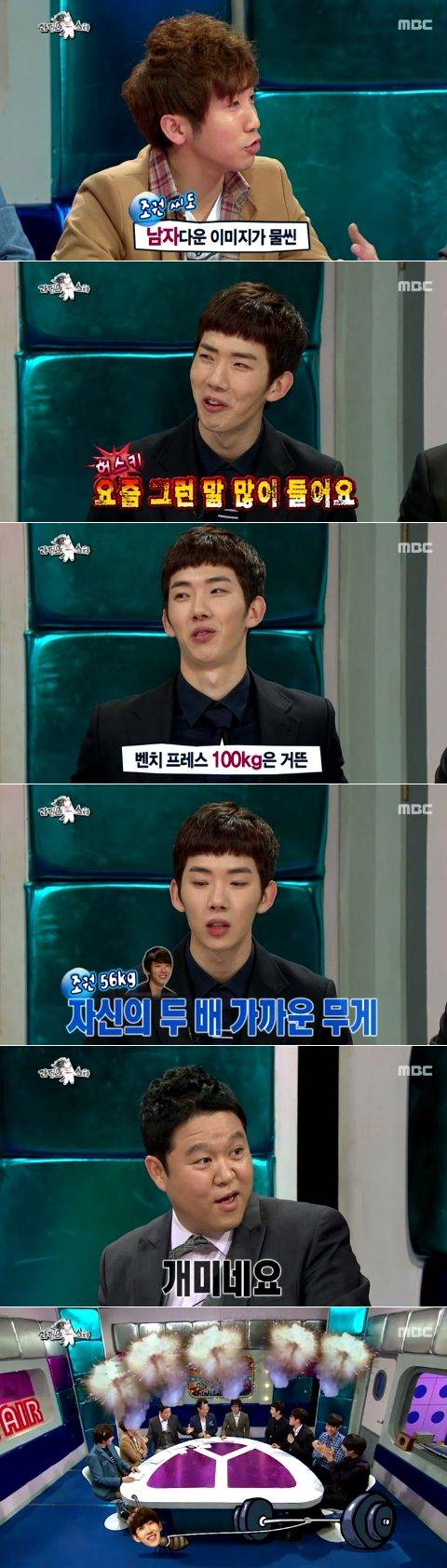 놀란 김구라가 "지금 몸무게가 몇키로냐"가 묻자 조권은 "지금 56kg이다. 두 배 가까이 되는 벤치 프레스를 든다"고 설명했다. 그러자 김구라는 "거의 개미수준이네. 정말 열심히네"라고 놀라 웃음을 자아냈다.