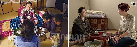 1_MBC < 해를 품은 달 > 의 1회 첫 장면 촬영 현장. 대왕대비 윤씨가 우아한 자태로 연꽃차를 마시는 장면을 예행연습하고 있다. 촬영 당시 세트장의 기온이 영하로 떨어진 상황이라 연꽃이 꽁꽁 얼어버려 스태프 모두 당황했다는 후문. 2_ < 애정만만세 > 의 한 장면. 충격적인 얘기를 털어놓기 전, "어서 차부터 마셔. 마음을 진정시키는 효과가 있어"라며 암시를 준다.