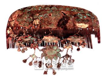신라 명품족들의 사랑을 한몸에 받은 명품빗. 장식용으로 머리에 꽂았다.보르네오 등에서 잡히는 거북등껍질인 대모로 만들었다. 청옥을 감입한 꽃무늬 금장식을 매달았다. 손잡이 부분은 금사로 각종 꽃무늬를 새겼다. | 호암미술관 소장 ■비취모, 공작미, 슬슬전…. 신라 명품 패션의 끝은?