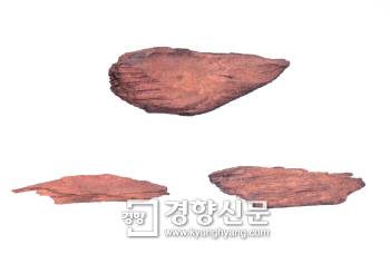 불국사에서 나온 명품 원목 '침향'의 조각들. 수마트라 등에서 난 것이었다. 요즘의 인도네시아산 고급 원목의 원조이다. | 이한상 대전대 교수 제공'호화·사치품'으로 규정돼 밀수로 통용될만큼 중국 명품족의 사랑을 받았던 비취모…. 그것이 400년 전에 신라 '명품족'의 넋을 빼앗았다는 것이 된다. '공작미'는 인도와 아프리카, 동남아 일대에서 서생하는 공작새의 꼬리를 뜻한다. '슬슬전'도 마찬가지였다. '슬슬'은 이란어계인 '세세(Se-se)'이며 에메랄드를 일컫는다. < 신당서 > '고선지전'은 "고선지 장군이 석국(石國·타슈겐트)에서 슬슬 10여석을 획득했다"고 기록했다. '전(鈿)'은 꽃 모양의 금이나 광채나는 자개 조각을 박아서 장식하는 것이다. 결국 슬슬전은 수많은 에메랄드를 알알이 상감해서 장식한 명품이었다. '대모'는 거북등껍질이다. 보르네오(渤泥)와 필리핀 군도, 자바(도婆) 등에서 포획한 사치품이었다.