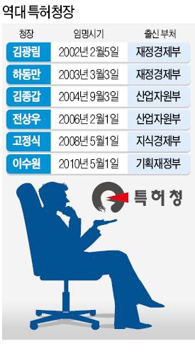 특허청장은 1977년 특허국 및 심판소가 청으로 승격한 뒤 줄곧 상공부 통상산업부 산업자원부 등 현 지경부 전신 부처의 공무원들로 채워졌다. 하지만 이 같은 관행은 고위 공무원단의 인사 적체를 견디다 못한 재경부가 산하 조직·기관이 많은 산업자원부로 눈을 돌리면서 깨졌다. 재경부는 2002년 2월 "경제기획원 출신으로 정책 전반을 경험한 만큼 타 부처의 수장 자리로 가도 전문성에 문제가 없다"는 논리를 앞세워 김광림 청장 임명을 관철시켰다. 김 청장에 이어 하동만 청장까지 재경부 출신이 특허청으로 간 뒤 산자부 내 반발 목소리가 커지자 18대, 19대 청장은 다시 산자부 몫으로 돌아갔다.