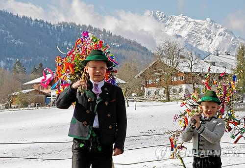 epa03167674 Two boys wearing traditional dresses carry their magnificently decorated palm branches to the blessing in the church in Loipl, Germany, 01 April 2012. The blessed bunches of willow catkin will be put on houses and stables. Popular belief is that they will prevent from lightning strokes and bring luck. EPA/DIETHER ENDLICHER ☞ 日 규모 9급 서일본·수도권 대지진 공포(종합) ☞ "오프라 윈프리는 복잡하고 모순적인 놀라운 여성" ☞ 泰 3차례 폭탄테러…10명 사망·100명 부상(종합) ☞ -탁구세계선수권- 한국 남녀대표팀 결승진출 좌절 ☞ < 6자회담 당사국들, 北로켓 관련 다각 접촉 >