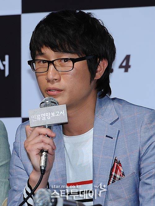 2일 오후 화양동 롯데시네마 건대점에서 열린 영화 '인류멸망보고서'의 언론시사회에 참석한 출연배우 송새벽이 취재진의 질문에 답하고 있다.