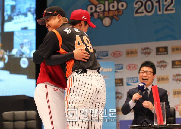 윤석민이 3일 서울 성균관대학교 600주년기념관 새천년홀에서 열린 '2012 프로야구 미디어데이'토크쇼에서 지난해 타구에 맞은 것에 대해 사회자의 중재로 홍성흔과 화해의 포옹을 하고 있다.