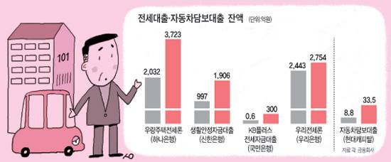 전세금이나 자동차를 담보로 돈을 빌리는 이른바 `생계형 대출`이 급증하고 있는 것으로 나타났다. 정부가 작년 하반기부터 가계대출을 옥죄면서 주택담보대출이나 신용대출이 어려워진데다 최근 서민들의 살림살이가 악화되면서 생활비 등을 충당하기 위한 급전대출이 크게 늘고 있기 때문이라는 게 금융권의 관측이다. 9일 금융권에 따르면 지난 3월말 국민·신한·우리·하나 등 4대 시중은행의 전세금담보대출 잔액은 8413억원으로 1년전 같은기간(5472억원)에 비해 2940억원, 53%나 급증했다. 하나은행의 `우량주택 전세론` 잔액은 지난해 3월말 2000억원 수준이었지만 올 3월말엔 3723억원으로 1년새 두 배 가까이 급증했다. 2008년 9월 대출상품을 출시할 당시만 해도 1년간 실적이 460여억원에 그쳤지만 지난해 하반기부터 매달 200억원 이상씩 늘어나는 등 꾸준한 증가세를 보이고 있다. 신한은행이 전세금을 담보로 생활비를 대출해주는 `생활안정자금대출` 잔액도 3월말 현재 1970억원으로 작년 3월말에 비해 두 배이상 늘었다. 우리은행의 `우리전세론` 잔액은 3월말 현재 2754억원을 기록해 1년 전보다 300억원 이상 늘었고, 국민은행의 `KB플러스 전세금대출` 잔액도 작년 11월 출시 당시 실적은 6000만원에 불과했지만 불과 넉달여만에 30억원대로 급증했다. 주로 캐피탈사들이 취급하는 자동차 담보대출도 서민들이 급전을 마련하는 주요 통로로 활용되고 있다. 현대캐피탈이 지난해 11월 출시한 자동차담보대출 잔액은 3월말 현재 34억원 수준으로 출시 당시보다 4배 이상 급증했다. 이에 앞서 출시된 아주캐피탈의 `오토담보론` 잔액 역시 2010년말 80억원에서 지난해말엔 130억원으로 60%이상 늘었다. 기존에 대부업체와 사금융업체를 중심으로 고금리, 소액대출 방식으로 운영되던 자동차 담보대출시장은 캐피탈사들이 뛰어들면서 판도가 크게 바뀌고 있다. 캐피탈사들은 카드론보다 저렴한 15% 안팎의 금리를 앞세워 은행에서 돈을 빌리기 어려운 서민들을 집중 공략하면서 대출규모를 빠르게 늘리고 있다. 전세금이나 자동차 담보대출이 급증하고 이유는 그만큼 서민들의 살림살이가 어려워지고 있다는 반증이라는게 금융권의 분석이다. 정부의 가계부채 억제대책과 함께 일반 가계대출이 크게 까다로워진 것 역시 주된 배경으로 작용하고 있다. 고윤주 신한은행 개인금융부장은 "서민들의 기본 생계비용이 늘면서 살림살이가 팍팍해진데다 기존 신용대출보다 금리도 낮아 전세금 대출이 크게 늘고 있다"며 "이 같은 추세라면 올해 은행마다 3000억~4000억원씩 대출이 늘어날 것"이라고 전망했다. ◇ 전세금담보대출
