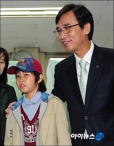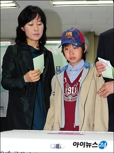 제19대 국회의원 선거일인 11일 오전 경기도 고양시 화수중학교에서 유시민 통합진보당 대표가 아내 한경혜씨, 아들 유지현군과 함께 한 표를 행사하고 있다.