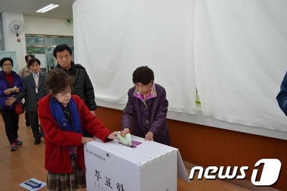 경남 진주지역 최고령 유권자인 김우희악 할머니(104)가(사진 왼쪽) 11일 딸과 함께 투표장을 찾았다.(사진제공=진주시 중앙동) News1 |