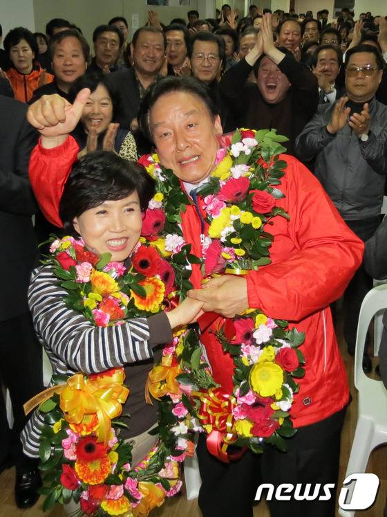 4.11총선 경북 포항남ㆍ울릉 김형태 새누리당 후보가 오광장 선거캠프 사무소에서 개표 방송을 지켜보던 중 당선이 유력해지자 부인과 함께 자축하고 있다.