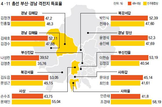 문익환의 아들이자 김대중의 아들인, 그리고 노무현의 동생인 문성근은 표가 나오는 방식이 아니라 그가 하고 싶은 선거운동을 하고서도 45.15%의 득표율을 기록했다. 문재인(사상)과 조경태(사하을)는 당선했다.