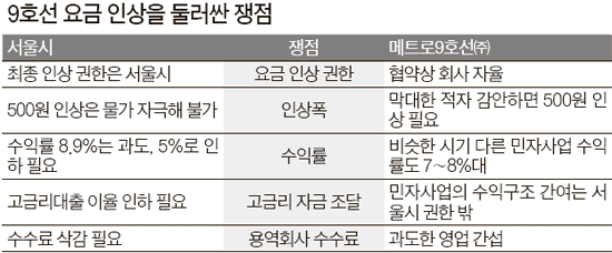 서울시는 지난달 27일 9호선 사업자인 서울시메트로9호선㈜에 '2005년 맺은 협약상 수익률(8.9%)이 과도하니 5%로 낮추자'는 내용의 공문을 보냈다. 당시 메트로9호선 측은 "500원가량 요금을 인상해야 적자를 벗어날 수 있다"며 서울시에 요금인상을 요구하고 있었다.