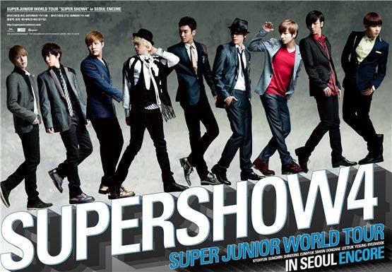 슈퍼주니어가 오는 5월 26, 27일 양일 간 서울 올림픽공원 체조경기장에서 < SUPER JUNIOR WORLD TOUR "SUPER SHOW4" in SEOUL ENCORE > 를 개최한다. 지난해 11월 서울 콘서트로 월드 투어를 시작했던 슈퍼주니어는 공연을 다시 보고 싶어 하는 국내 팬들을 위해 서울에서 다시 콘서트를 열기로 했다. SM엔터테인먼트 측은 "이번 콘서트는 슈퍼주니어의 히트곡 무대와 함께 멤버들의 개별 무대로 채워지며 다양한 무대 연출이 특징이다"라며 기대감을 나타냈다.