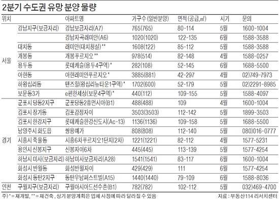 2분기(4~6월) 전국 138개 단지에서 10만2702가구가 분양된다. 1분기(3만4632가구)의 3배 가까운 물량이다. 서울과 경기 인천 등 수도권에서는 전체 물량의 58%인 5만9387가구가 분양된다. 특히 저렴한 분양가로 인기가 많은 LH(한국토지주택공사) 보금자리주택과 입지여건이 좋은 서울 도심권 재개발 단지들이 많아 '내집 마련'을 꿈꾸는 실수요자들의 관심이 많을 것으로 전망된다.