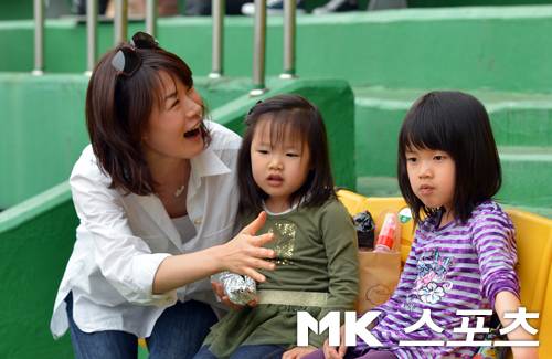 29일 청주 야구장에서 벌어진 한화와 넥센의 경기에서 박찬호의 부인 박리혜씨가 남편 박찬호의 선발경기를 보기 위해 두 딸과 함께 청주구장을 찾았다. 박리혜씨가 취재진이 몰리자 당황해 하며 웃고 있다.