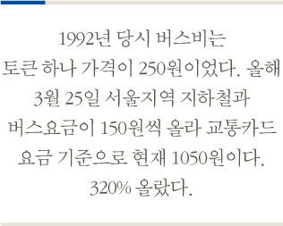 교통비는 큰 폭으로 상승한 항목 중 하나다. 당시 버스비는 토큰 하나 가격이 250원이었다. 올해 3월 25일 서울지역 지하철과 버스요금이 150원씩 올라 교통카드 요금 기준으로 현재 1050원이다. 320% 올랐다. 최근 민간 노선 9호선 요금이 오는 6월 500원 인상된다면 1550원이 돼 20년 전에 비해 520% 인상되는 셈이다.