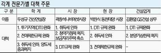 곽창석 나비에셋 사장도 "현재 서울 강남권에 급매물이 많이 나와있어도 대출이 안 나와 갈아타기를 못하는 사람들이 많은데 DTI 규제가 풀리게 되면 이들 지역으로 갈아타기 수요가 유입되고 또 자신이 살고 있는 집을 다른 사람에게 팔게 되는 등 주택시장 선순환 구조가 다시 형성될 수 있다"고 설명했다. 이는 건설업체 입장에서도 마찬가지다. GS건설 주택사업 임원인 김환열 상무는 "가장 시급한 것은 시장에 유동성을 공급해 주는 것인데 이게 막히다 보니 주택시장 침체가 더욱 깊어지고 있다"며 "주택시장에 가장 중요한 주택금융을 살려놔야 수요도 살아나게 될 것"이라고 말했다.