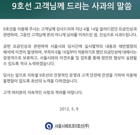 서울지하철 9호선 사업자인 메트로9호선은 9일 오후 1시 9호선 전 역사와 인터넷 홈페이지에 '9호선 고객님께 드리는 사과 말씀(사진)'을 게시하고, 당초 다음 달로 예정한 요금인상안을 잠정 보류한다는 내용의 공문을 전달했다.