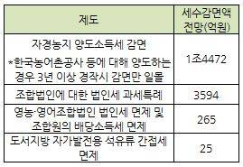 다른 재정부 관계자는 "우리나라에서 '농(農)'자가 들어가면 건드리기가 쉽지 않기 때문에 일몰은 대부분 연장하는 방향이 될 것"이라며 "새로운 비과세나 감면제도 도입을 막기만 해도 세수 부분에서는 성공적"이라고 말했다.