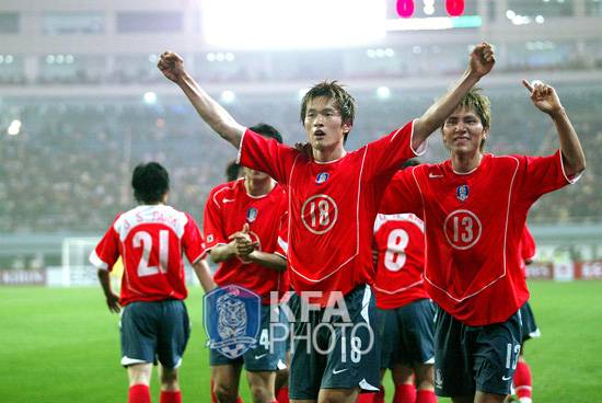 아테네 올림픽 아시아 최종예선을 전승으로 통과한 올림픽대표팀과 조재진 ⓒKFA 홍석균