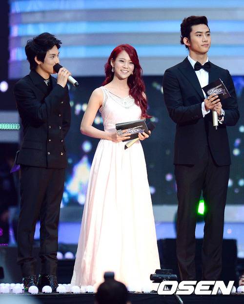 [OSEN = 백승철 기자] 12일 오후 서울 상암동 서울월드컵경기장에서 열린 '사랑한다 대한민국 2012 드림콘서트'에서 임시완, 한승연, 택연이 인사말을 하고 있다.