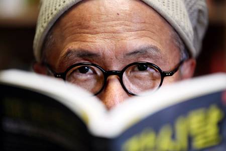 15일 서울 자곡동 화실에서 만화가 허영만이 자신의 작품'각시탈'책장 너머로 시선을 들었다. 그는"일제강점기를 만화로 다뤄보고 싶어 시작한 작품이 각시탈"이라고 했다. /이덕훈 기자 leedh@chosun.com