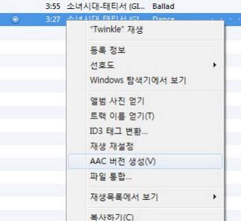 벨소리 구간을 설정했으면, 이제 벨소리 파일을 만들 차례. 이제 노래 파일에서 마우스 우 클릭한 뒤에 등록정보가 아닌 'AAC 버전 생성'을 선택하자.