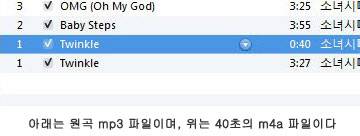 그러면 똑 같은 노래 파일명이 하나 더 생긴 것을 확인할 수 있는데, 이 파일은 mp3 파일이 아닌 m4a 파일이다. 참고로 m4a 파일은 ACC 인코더로 인코딩된 애플의 무손실 오디오 포맷 파일을 뜻한다.