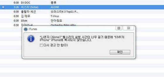 그리고 아이튠즈에서 만드는 벨소리는 최대 40초의 시간 제한이 있다. 만약 40초가 넘는 벨소리를 만들어 아이폰에 넣으려고 할 경우, 아래 스크린샷처럼 경고창이 뜨고 인식이 되지 않으니 참고하도록 하자.
