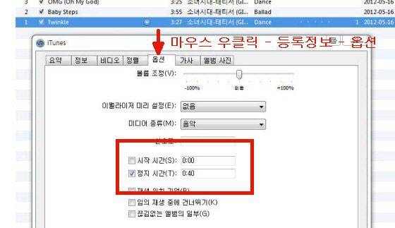 여기서는 소녀시대 태티서의 '트윙클(twinkle)'로 벨소리를 만들어보도록 하겠다. 노래 파일에서 마우스 우 클릭한 뒤에 '등록정보' 창을 연 후, 상단 메뉴의 옵션을 클릭하자. 노래에서 벨소리로 설정하고자 하는 구간을 조절하기 위해서다. 아래 스크린샷처럼 시작 시간에 만들고자 하는 벨소리의 처음 부분을 넣고, 정지 시간에 끝나는 부분을 넣으면 된다. 앞서 언급한 것처럼 최대 40초로 만들 수 있다는 점을 기억하자. 처음부터 만든다면 시작 시간은 0:00로 입력하고, 정지 시간은 0:40으로 입력하면 된다.