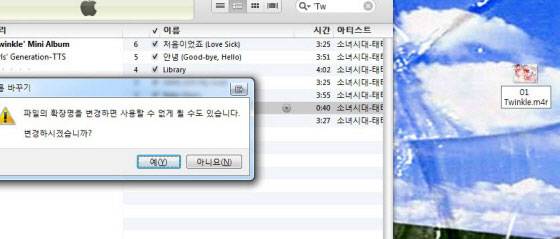 위 스크린샷 처럼 m4a 파일을 아이튠즈에서 바탕화면으로 드래그에 끌어 내도록 하자. 그리고 파일 의 확장자를 그냥 키보드로 입력해 m4r로 바꾸면 된다. 확장자를 바꿀 때 경고 메시지가 나올 수도 있는데, 걱정하지 말고 확인 버튼을 누르면 된다.