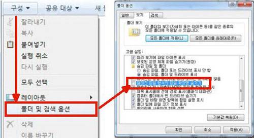 지금까지 윈도의 설정 메뉴를 건드리지 않았다면 mp3, m4a, m4r과 같은 확장자는 볼 수 없을 것이다. 이는 위 경고 메시지처럼 잘못하면 파일을 사용할 수 없기 때문에 윈도 설정에서 숨겨져 있기 때문이다. 이 때는 아래 스크린샷처럼 윈도 폴더창을 열고(윈도7 기준)왼쪽 상단 메뉴에서 [구성]-[폴더 및 검색옵션]을 클릭하고, 폴더 옵션에서 [보기] 탭 중 '알려진 파일 형식의 파일 확장명 숨기기'를 체크 해제하면 된다.