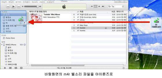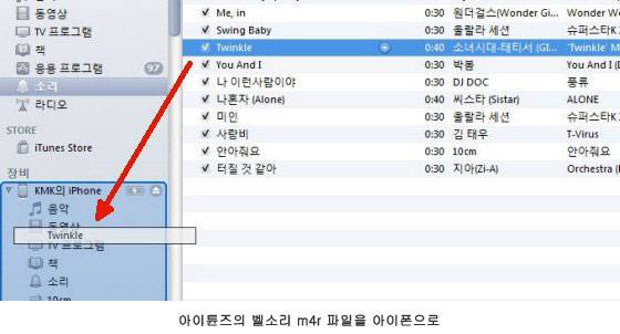이제 바꾼 m4r 파일을 아이튠즈에 드래그해서 넣으면 된다. 아이튠즈에 넣은 벨소리는 소리 메뉴를 누르면 확인할 수 있다. 마지막으로 아이폰을 PC에 연결해 아이튠즈에 저장한 벨소리를 다시 아이폰으로 넣으면 모든 과정은 끝이다.