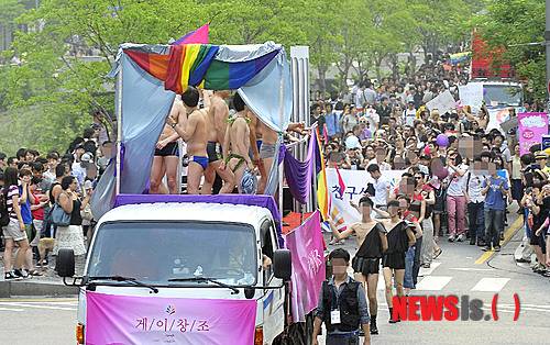 【서울=뉴시스】최동준 기자 = 2일 오후 서울 청계2가 을지 한빛광장에서 열린 '2012 퀴어문화축제'에서 참가자들이 '성소수자에게는 해방을, 일반인에게는 소통'의 장을 마련하기 위해 최대 규모의 '게이 퍼레이드'를 진행하고 있다.