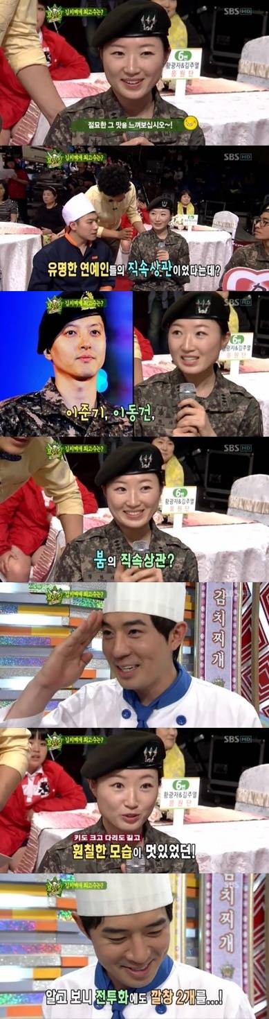 또 여군은 함께 근무한 연예사병이 있냐는 질문에 "이준기, 이동건, 싸이와 같이 근무를 했다. 붐의 직속상관이기도 하다"고 했다. 실제 붐은 이미 거수경례를 하고 있었다.