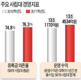 사립대 재정에서 등록금 수입이 차지하는 비중이 2010학년도 74.9%에서 작년 76.2%로 1.3%포인트 높아졌다. 지난해 대학가에 '반값 등록금' 압박이 거세게 불면서 수익 구조 다변화가 대학들에 중요한 과제로 부상했지만 등록금 의존도는 오히려 심화된 것이다.