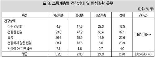 신체 건강은 저소득층의 경우 절반에 가까운 45.5%가 건강이 좋지 않다고 응답한 반면 고소득층은 6.7%에 불과했고, 중산층은 15.2%였다.