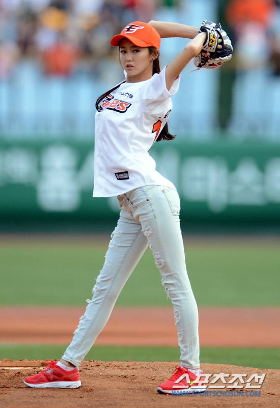 이날 오초희는 몸매가 드러나는 화이트 스키니 진에 한화 유니폼을 착용한 채 나타나 작은 얼굴과 긴 팔다리로 운동화를 신고도 놀라운 비율을 자랑해 눈길을 끌었다.
