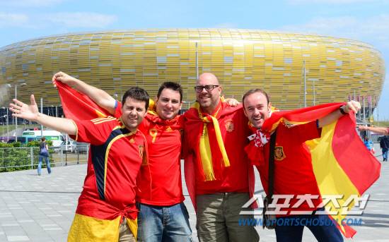 11일(한국시각) 오전 1시 폴란드 그단스크 아레나에서 열리는 유로 2012 스페인과 이탈리아의 경기를 앞두고 스페인에서 원정응원을 온 팬들이 경기장 앞에서 포즈를 취하고 있다. 그단스크(바르샤바)=정재근 기자 cjg@sportschosun.com/2012.06.11/