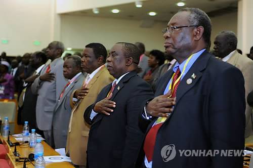 epa03259596 A handout picture released by the United Nations Mission in South Sudan (UNMSS), shows members of the South Sudan National Legislative Assembly listening to the national anthem during the opening of Second Session of the Assembly in Juba, South Sudan, 11 June 2012. In his speech before the Assembly, President of South Sudan Salva Kiir said renewing the United Nations Mission in South Sudan with the same mandate would be inappropriate, saying conditions under which it was approved at the beginning had changed. EPA/ISAAC BILLY/HANDOUT HANDOUT EDITORIAL USE ONLY/NO SALES ☞ < 통합진보당 신-구당권파 당권경쟁 열기 > ☞ 뮤지컬 '원스', 美 토니상 8개상 석권 ☞ "믿으면 행복"..美 개신교 지도자, 가정폭력 체포 ☞ -유로2012- 스페인·이탈리아 1-1 무승부(종합) ☞ 이해찬, 여야정 경제협의체 제안.."민생경제 우선"