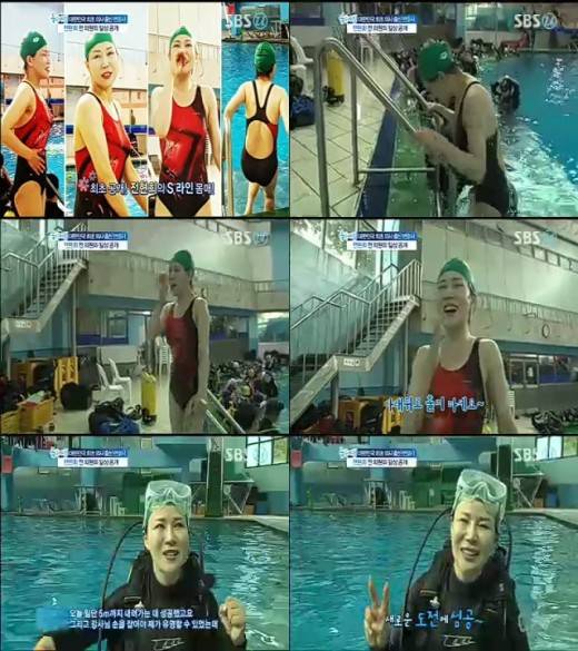 이날 모습을 드러낸 전현희 전 대변인의 수영복 입은 모습. 그는 수줍은 미소를 지으며 제작진에게 "아래위로 훑지 말아 달라"고 부탁했다.