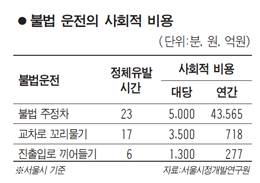 12일 서울시정개발연구원이 발표한 '불법운전의 사회적 비용'에 따르면 서울 시내에서는 한 시간 동안 ㎞당 약 20대의 차량이 평균 200초에 걸쳐 불법 주정차를 한다. 1대의 불법 주정차는 약 23분의 교통정체를 유발하며 이를 사회적 비용(시간ㆍ에너지ㆍ환경 등을 고려해 산출)으로 환산하면 약 5,000원에 달한다. 매년 서울시에서만 불법 주정차로 발생하는 비용이 4조3,565억원인 셈이다.